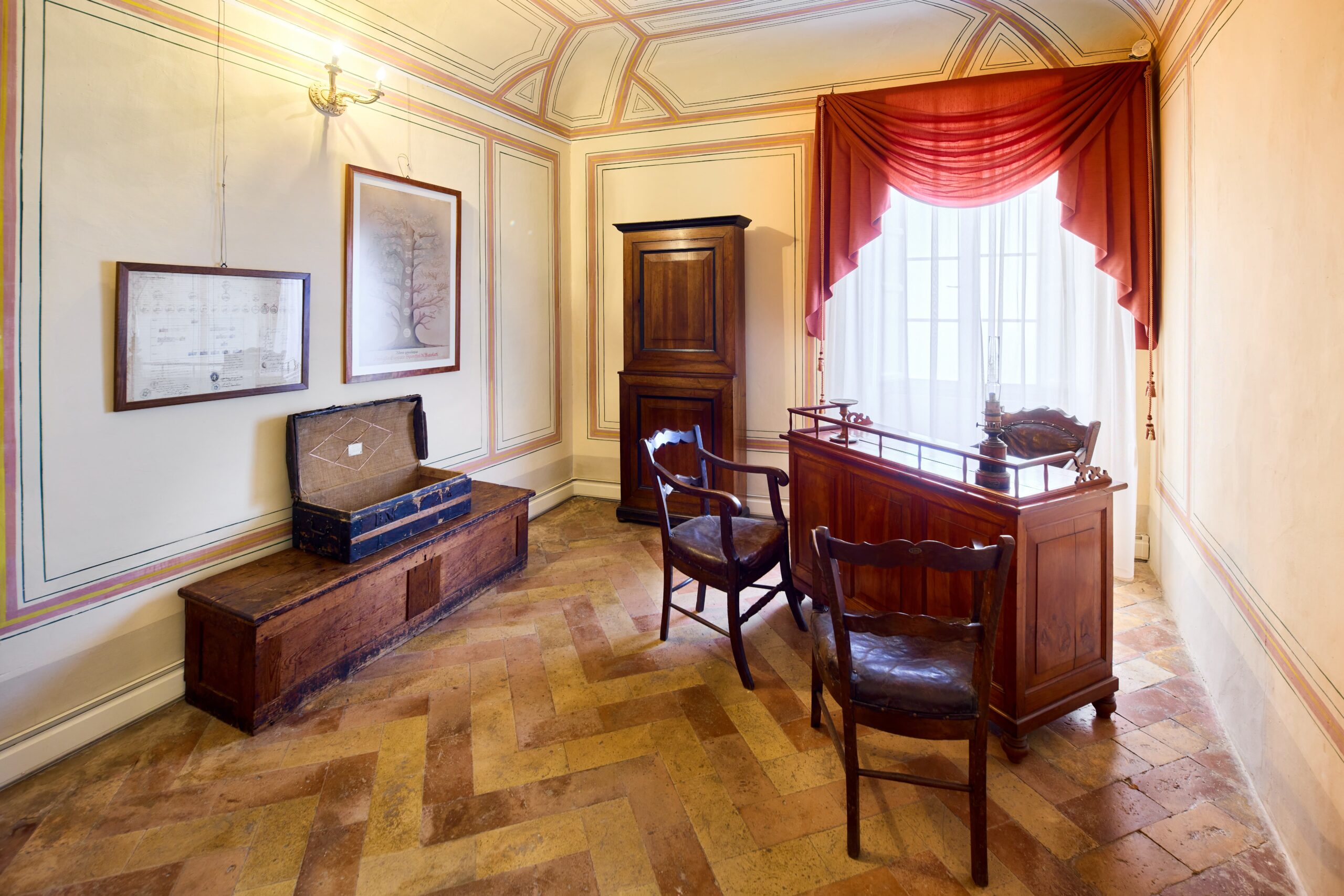 Questo spazio culturale ha sede nella casa che il compositore e filantropo Gaspare Spontini nato a Maiolati nel 1774, fece costruire con l’intenzione di farne la propria residenza al ritorno nella sua città natale. Inizialmente destinato alla vita religiosa per volere paterno, seguendo le orme dei fratelli, il giovane Spontini fu inviato dallo zio paterno don Giuseppe Spontini presso la chiesa di Santa Maria del Piano a Jesi e successivamente ammesso nel seminario. Tuttavia, insofferente agli studi ecclesiastici, riuscì a dedicarsi alla musica, vincendo l’opposizione del padre e completando la sua educazione musicale. La sua carriera lo portò dalle corti europee, dalla Francia di Napoleone alla Berlino di Federico Guglielmo III di Prussia. L’edificio che ospita il Museo è la casa che i coniugi Spontini avevano fatto costruire con l’intenzione di farne la propria residenza al ritorno a Maiolati, cosa che avvenne solo nel settembre 1850 e per pochi mesi. Il vecchio edificio rurale, acquistato dal compositore nel 1842 dalla famiglia Valchera, venne ristrutturato in stile neoclassico tra il 1843 e il 1846 dall’architetto jesino Ciriaco Santini, in costante contatto epistolare con i proprietari. Qui Gaspare Spontini trascorse con sua moglie Maria Caterina Celeste Erard gli ultimi mesi della sua vita, fino alla morte avvenuta il 24 Gennaio 1851. Dopodiché l’edificio continuò a ospitare i soggiorni maiolatesi di Celeste Erard, tornata a vivere in Francia, e divenne sede della Reggenza delle Opere Pie. Nel corso degli anni, tra il 1920 e il 1936, la casa subì diverse trasformazioni, ospitando il Municipio, una scuola elementare, la tesoreria, una farmacia, case popolari, un deposito di cereali e un magazzino. Queste continue modifiche portarono alla perdita di molti oggetti originari della casa: ne è un esempio il perduto corrimano in legno che sormontava la ringhiera di ferro che percorre l’intera scalinata. Solo nel 1951, in occasione del primo centenario della morte del compositore, l’edificio fu trasformato in Museo e, su proposta del Ministero della Pubblica Istruzione, con P.R. 19 Giugno 1951 n.1092, venne dichiarato Monumento Nazionale. Le stanze del secondo piano si snodano lungo un corridoio. Le pareti e i soffitti intonacati presentano volte a gavetta decorate con motivi floreali e geometrici, mentre i pavimenti sono in cotto. Questi ambienti, che un tempo costituivano la zona privata dei coniugi Spontini e custodiscono pregevoli arredi, offrono una suggestiva ricostruzione dell'atmosfera di ciò che poteva essere una ricca dimora nobiliare dell'epoca. Inoltre, in fondo al corridoio una porta nasconde una piccola curiosità: un essenziale bagno in casa, molto raro nelle dimore dell’epoca che lo avevano solitamente all’esterno. Tra le stanze spicca il piccolo studio, arredato con pochi elementi lineari in linea con il gusto neoclassico. Vi si trovano lo scrittoio, le poltrone in cuoio e l’armadio tipici del XIX secolo. Sono conservati anche due bauli da viaggio appartenuti a Spontini: il più piccolo è di ambito francese, come testimonia l’etichetta di una fabbrica parigina.