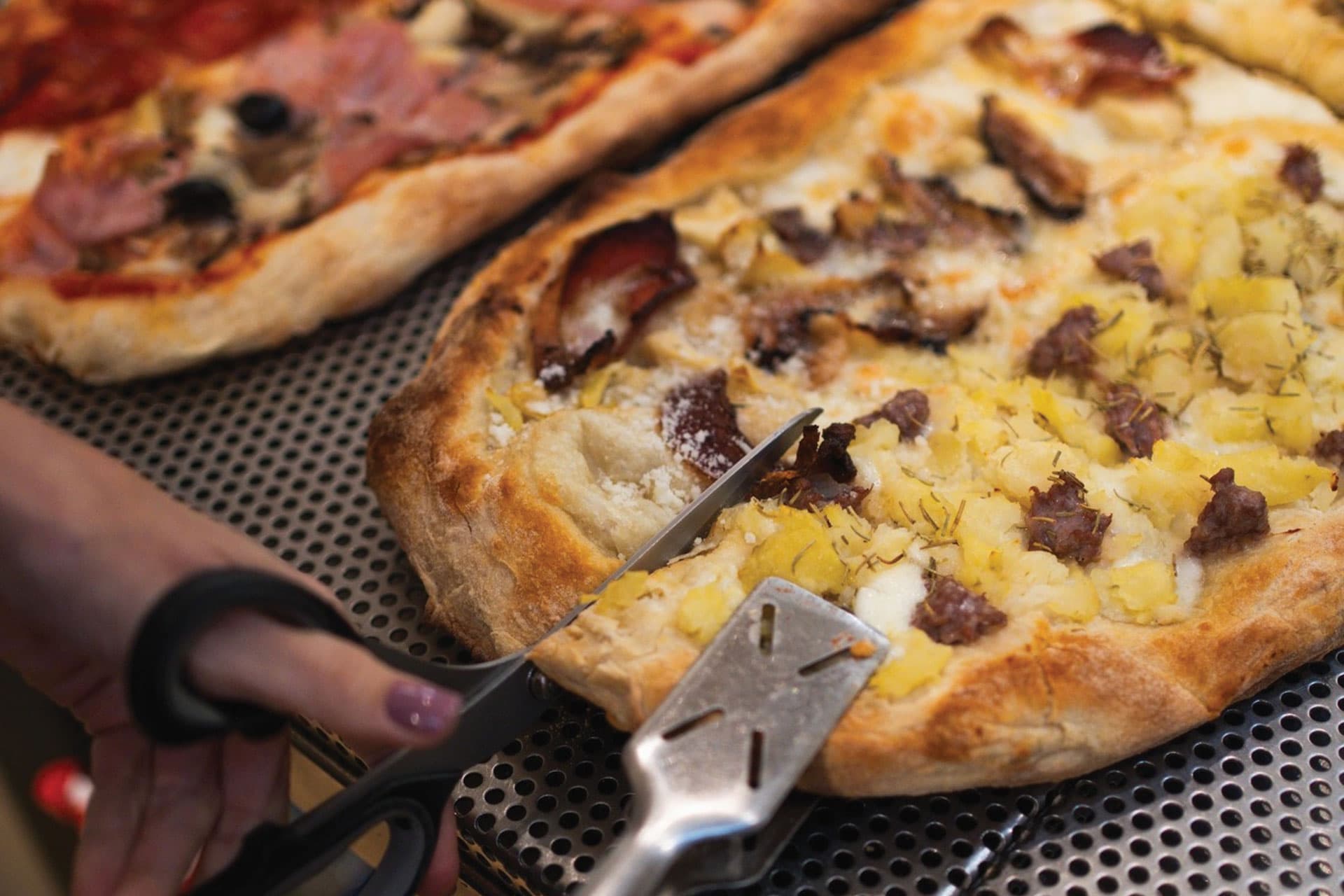 Offre una vasta scelta di pizze, sia classiche che speciali, disponibili al piatto, al taglio e anche al metro.
